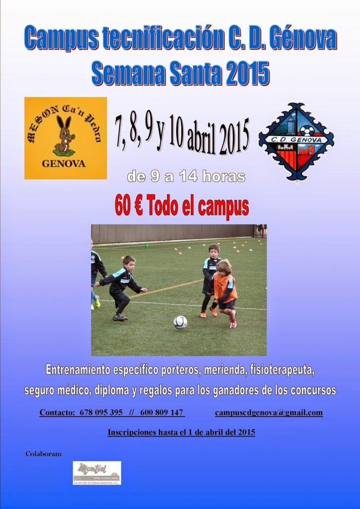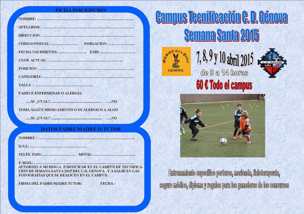 Base Campus Tecnificación CD Génova Semana Santa 2015 Por Redacción - 23 marzo, 2015 A continuación os ofrecemos los carteles del Campus de Tecnificación de Semana Santa 2015 del CD Génova: CD Génova. Artículo relacionadosMás del autor «No puedo volver a traicionarme a mí mismo» Mallorca – Celta: Un duelo bajo el calor de Son Moix Javier Aguirre: «Debemos mantener la seriedad, será un rival complicado» Publicidad