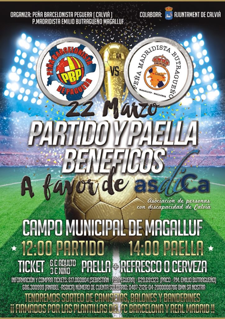 Los Socios de ambas Peñas disputarán a partir de las 12:00 horas un «mini clásico» donde se disputarán algo más de 3 puntos, algo más que el primer puesto en la clasificación general de la Liga BBVA, algo más que entrar o no en la Champions League, nos jugamos que un grupo de chavales con otras capacidades, no discapacidades, puedan seguir obteniendo apoyo de esta gran asociación «Calvianera» como es ASDICA. Posteriormente al partidazo, tendrá lugar una paella realizada por el prestigioso chef de la zona de Calvià, Germán Navas, reconocido por sus fantástica paellas. Durante la comida, tendrá lugar un sorteo solidario de varios productos de Merchandasing de ambos equipos (camisetas, balones y banderines) firmados por las estrellas de ambos equipos. El precio del ticket para poder presenciar el partido, degustar la paella con una consumición es de 6€ para adultos y 3 € para niños. Todos los beneficios obtenidos de la venta de tickets y del mini bar que habrá en las instalaciones durante el evento, irán íntegramente destinados a la ASDICA, con el fin de prolongar las actividades que realizan con estos chicos/as del término.