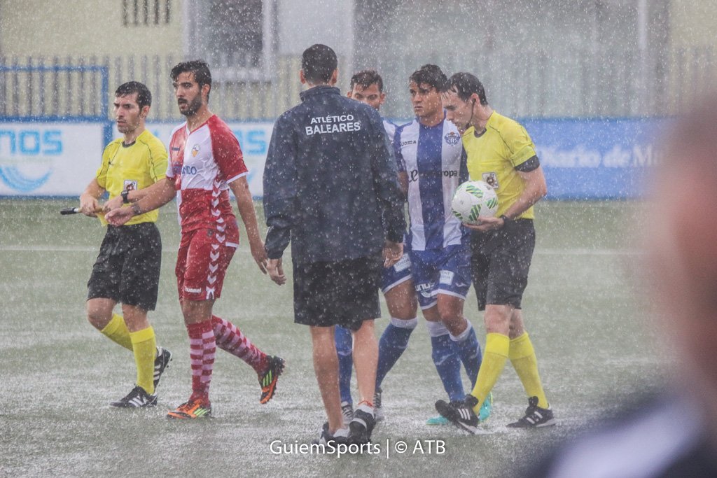 Atlético Baleares y Sabadell empataron a uno en un partido pasado por agua. El partido estuvo marcado por la suspensión en el minuto 9 por el tremendo aguacero que caía sobre el césped de Son Malferit. El colegiado Fernando Navarro Collados decretó la suspensión del partido.