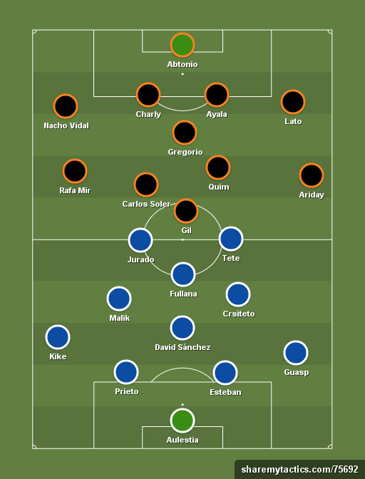 Era tan claro el sometimiento de los visitantes que fue inevitable que llegarán las ocasiones. Le tocó a Mir una de las más claras para el filial valencianista, quedándose a las puertas mano a mano con el portero Aulestia pero el guardameta vasco aguantó y repelió a la perfección. Eran minutos complicados para el conjunto blanquiazul y la defensa, esta vez formada en el lateral por un Kike que no se doblegó en defensa, vivía los peores momentos insertada en los últimos metros de campo propio. Y es que únicamente el sosiego local y el provecho del balón llegaba a partir de libres directos colgados precedentes de disputas de Rubén Jurado y Tete, este último fue un incombustible con una actuación ascendente durante todo el encuentro.