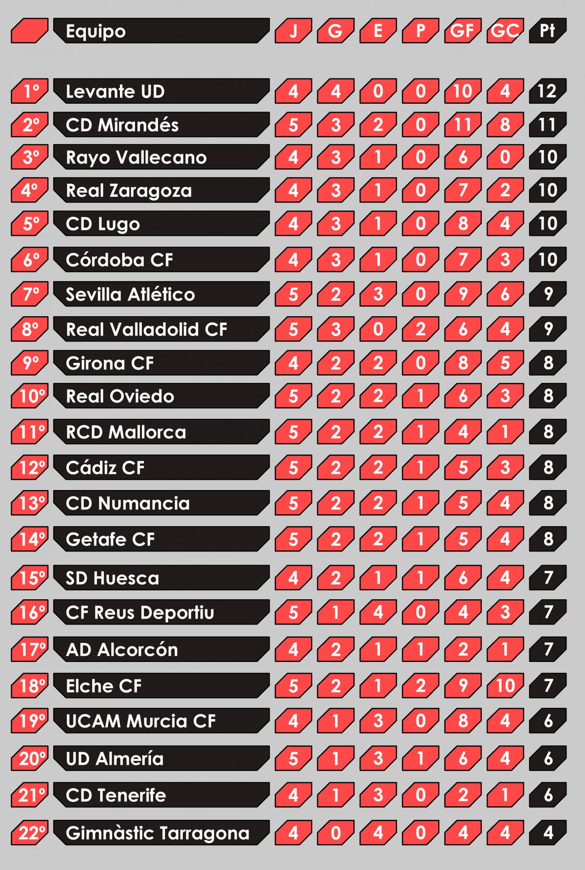 Da la casualidad que el conjunto de Fernando Vázquez visita al peor local en su siguiente salida. El Nou Estadi de Tarragona aún no ha sido testigo de ninguna victoria local, si bien es cierto que tampoco ha visto a su equipo perder. El Gimnàstic cuenta por empate todos sus partidos disputados como local, aunque eso le ha colocado como colista tanto en la clasificación general como si solo tuviésemos en cuenta los partidos como visitante.
