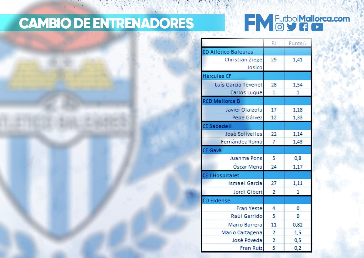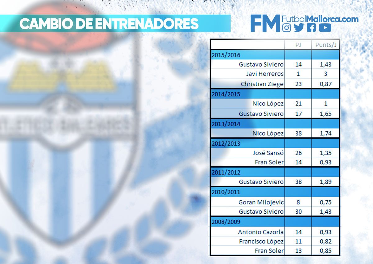 Uno de los cambios que más extraño se hizo fue el de Gustavo Siviero la temporada pasada. El entrenador argentino tiene los mejores números al frente del Atlético Baleares (y ojo que justamente viene este fin de semana a Son Malferit con un Lleida Esportiu en plena forma), pero la directiva decidió cesarlo para dar paso a Ziege (previo paso de Javi Herreros con su victoria en el Mini Estadi). Siviero tiene el mejor ratio de puntos con los balearicos, justamente el año que los hizo campeones, con 1,89 puntos por partido.
