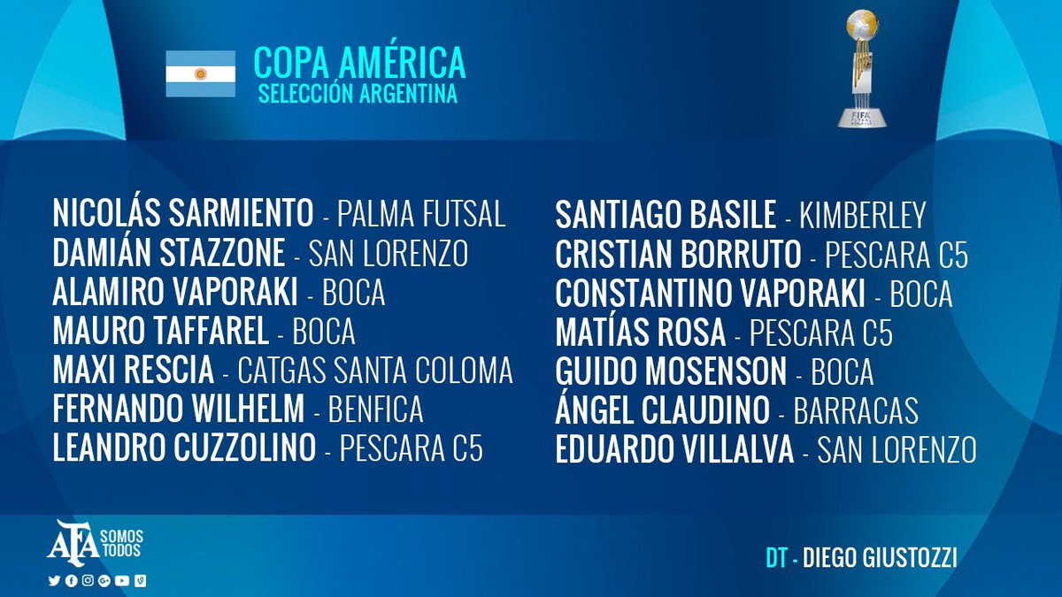 El seleccionador de Argentina de fútbol sala, Diego Giustozzi, ha hecho oficial esta misma tarde la lista de convocados para participar en la Copa América, que se disputará del 5 al 12 de abril en la ciudad argentina de San Juan. Tras conseguir levantar el título hace dos años en Ecuador y el Mundial de Colombia el pasado año, la selección albiceleste esperará levantar su tercer título consecutivo.