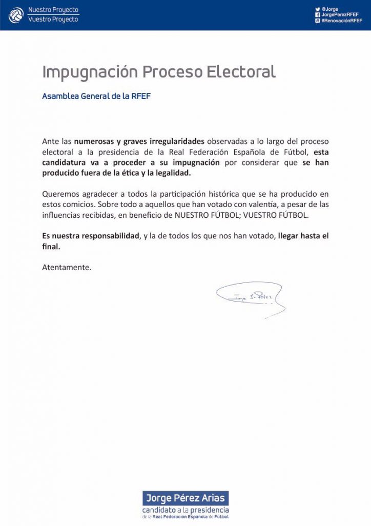 Jorge Pérez impugna el proceso electoral de la RFEF Por Redacción FM - 2 mayo, 2017 Jorge Pérez, candidato a la presidencia de la RFEF, ha impugnado el proceso electoral y acusa al Sr. Villar de varias irregularidades. El candidato a la RFEF ha difundido un comunicado a través de las redes sociales: Artículo relacionadosMás del autor ¿Hasta cuándo se van a reír del Mallorca? 25 jornadas… y cero designaciones UEFA ‘Elit’ El Comité Disciplinario de la RFEF: denuncias y sanciones Publicidad