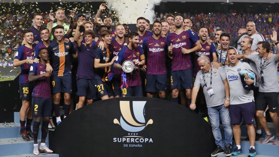 Como decía, ya tenemos a los dos supercampeones del verano. Por un lado el Barcelona, actual campeón de LaLiga, que se deshizo del Sevilla el domingo (arriba, en la foto de EFE) para conquistar una nueva Supercopa de España (para Messi, su trigésimo tercer trofeo, una barbaridad), y por otro el nuevo Atlético de Simeone, que fue capaz de remontar y tumbar a un Real Madrid todavía en construcción y al que le falta pólvora en ataque tras la marcha de Cristiano a Italia. (En la foto, el Atlético supercampeón alza el título europeo).