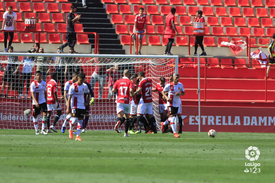 Dominio del Nàstic (con gol incluído) y ocasiones del Mallorca. El equipo visitante salió mejor al partido. Lago Junior, Salva Sevilla y Ante Budimir se pusieron manos a las obras en la tarea de crear ocasiones de gol. Y las crearon, pero ninguna de ellas fueron materializadas. El delantero costamarfileño tuvo la primera tras una buena jugada entre Sevilla y Budimir, pero el disparo de Lago terminó en las manos de Becerra. La oportunidad más clara fuer para Arida, quien estrelló el esférico en el palo tras una extraña jugada de Budimir -nadie sabe por qué no disparó él-. Más adelante, Sevilla también rozó el gol con un disparo que, inexplicablemente, se marchó fuera. La primera media hora fue para el equipo dirigido por Vicente Moreno, hasta que se terminaron las ideas para los bermellones. Sin embargo, hubo un punto de inflexión donde los locales comenzaron a dominar claramente el encuentro y, junto a ello, llegaron sus ocasiones. La más clara fue desde los once metros: Xisco Campos golpeó con la mano un centro local y el árbitro señaló penalti, que posteriormente erraría Uche. Él mismo, pocos minutos después, estrenaría el marcador tras un tremendo despiste defensivo. Por último, Noguera estrelló un potente disparo en el palo. Todo ello en un margen de cinco minutos, los que precederían al paso por los vestuarios.