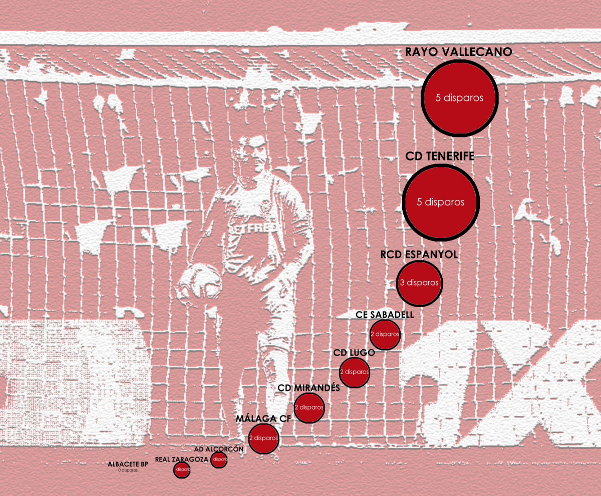 En el siguiente gráfico vemos que el número de remates entre los tres palos que recibe el equipo bermellón se pueden contar con los dedos de una sola mano, algo que alaba el gran nivel de Reina y el excelente inicio de temporada que está cuajando el conjunto balear a nivel defensivo.