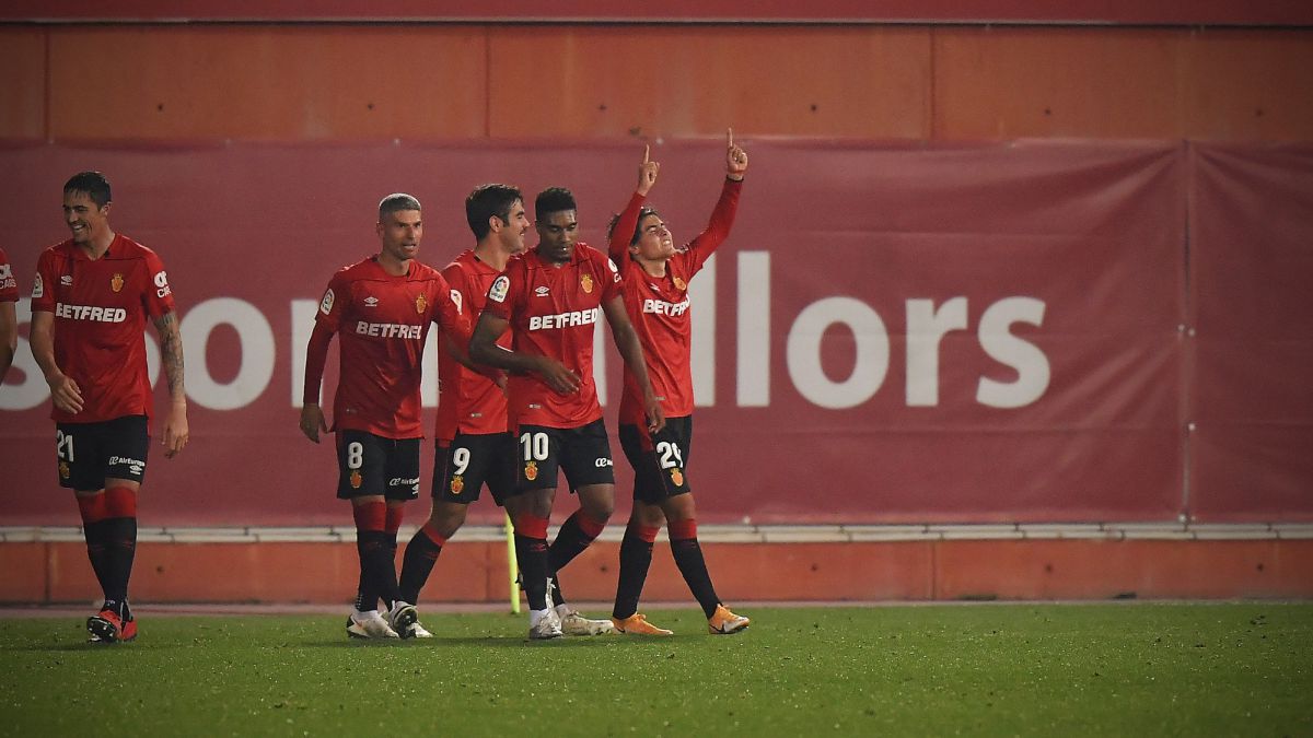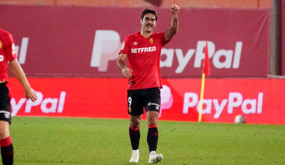 Abdón Prats celebrando su gol (3-0) ante el Logroñés en Son Moix. Foto: RCD Mallorca