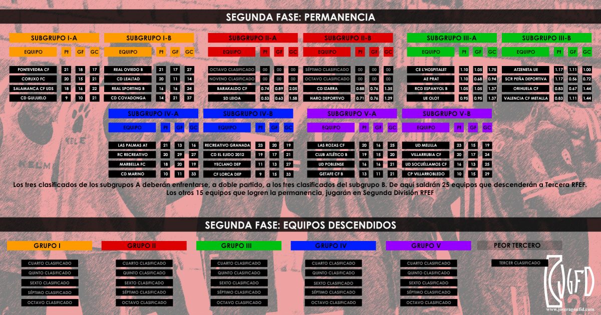Este segundo formato, que arranca el primer fin de semana de abril, dará a cinco equipos descendidos, salvándose tres en cada grupo. Pero hay que tener en cuenta que el peor tercero de los cinco grupos también perderá la categoría, por lo que la salvación solo la aseguran las dos primeras plazas.