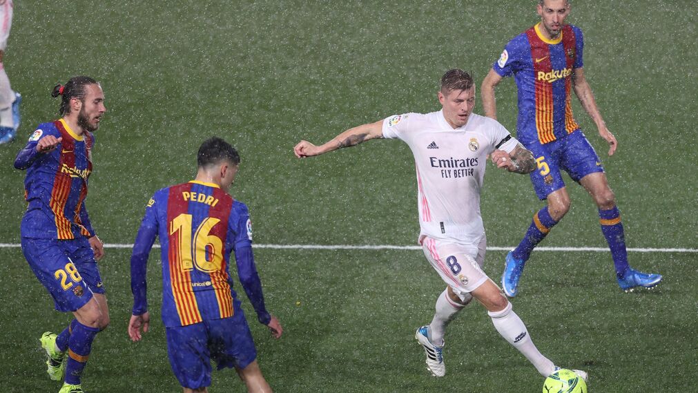 Real Madrid y Barcelona disputaron un nuevo ‘Clásico’, otro más, bajo un aguacero torrencial durante muchos minutos y con un chaparrón de jugadas complicadas, y dudosas de las que se va a hablar toda la semana. Aunque ya sabemos que los Medios de Comunicación no necesitan (necesitamos) muchos argumentos para agobiar a los seguidores con un mismo tema, sobre todo si afecta a los dos grandes. El sábado el Real Madrid se impuso después de una primera mitad espectacular en la que el Barcelona sencillamente no existió. Un sublime Benzema, de tacón, y Kroos, con un poco de fortuna, adelantaron a los blancos, que al descanso dominaban con claridad y sin pasar apuros ante un Barcelona inexistente al que Vinicius había destrozado. La segunda mitad fue distinta porque los catalanes se activaron y redujeron distancias por medio de Mingueza. La lluvia se sumó al partido y cayó de forma abrupta, impidiendo los movimientos de los jugadores y empapando sus camisetas. La foto del día fue ver a Messi cambiarse de zamarra completamente helado, tiritando de frío, mediada esta segunda mitad. Lo intentaron los culés hasta el final, pero sin fortuna. Mendy pudo hacer un penalti a Braithwaite (para unos lo es y para otros no; pero se pudo pitar) e Ilaix estrelló un balón en el larguero ya en el descuento que hubiera sido el empate. Finalmente ganó el Madrid, que pocas veces falla en las grandes ocasiones, y comprime LaLiga a falta de ocho encuentros.