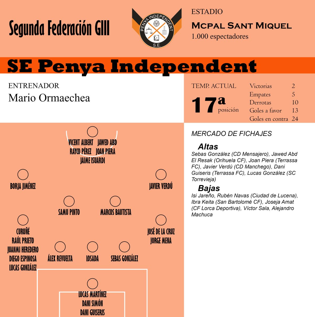 La Penya Independent sigue reforzándose de cara a buscar salir del descenso en la segunda vuelta que se inicia este fin de semana. De cara al carril izquierdo de la defensa ha llegado procedente del Torrevieja Lucas González. El lateral zurdo de 21 años llega tras jugar la primera mita de la temporada en el club alicantino que forma parte de la Primera FFCV, séptima categoría del futbol español. El futbolista de Torrevieja disputó 13 partidos, doce de ellos como titular. Este pasado fin de semana, en el partido de los ibicencos ante el Torrent, el lateral ya hizo su debut disputando seis minutos en la derrota del equipo en tierras valencianas.