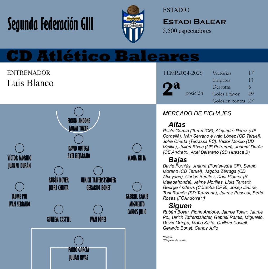 En el capítulo de renovaciones, el lateral derecho Carlos Julio renueva una temporada más con los balearicos tras jugar 29 partidos la temporada pasada. Por otro lado, Jaume Pascual no seguirá formando parte de la plantilla del Atlético Baleares.