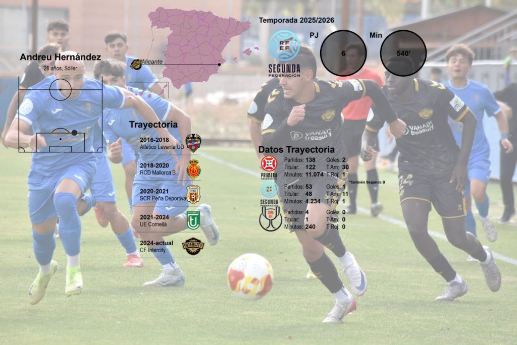 Esta semana hemos estado en el Fernando Torres viendo en directo a Andreu Hernández. El jugador mallorquín, de Sóller, tiene 28 años, y esta es su segunda temporada en el Intercity, equipo de la ciudad de Alicante. La temporada pasada el equipo alicantino jugó en Primera Federación, pero acabaron descendiendo, estando esta temporada en Segunda Federación.