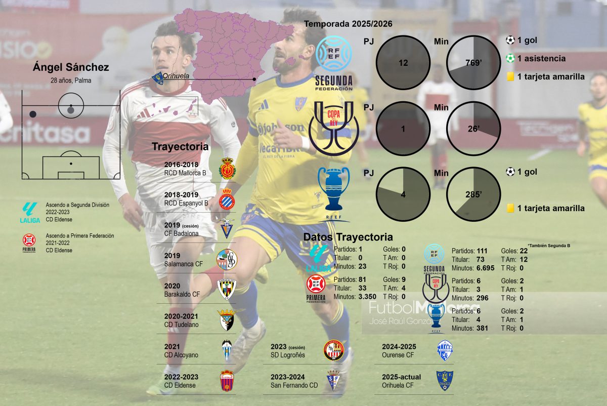 Esta semana hemos estado en el estadio de Matapiñonera viendo en directo a Ángel Sánchez. El jugador mallorquín, de Palma, tiene 28 años y llegó en el pasado mercado veraniego al Orihuela, en la zona sur de la provincia de Alicante. Ha llegado al equipo de la Vega Baja tras tres temporadas en Primera Federación.