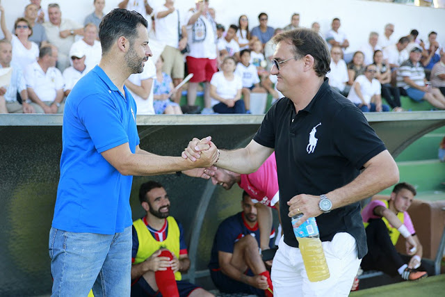 Mario Ormaechea saluda a Mere, del Algeciras, en un parido del play-off de la temporada pasada (Foto: Paco Natera).